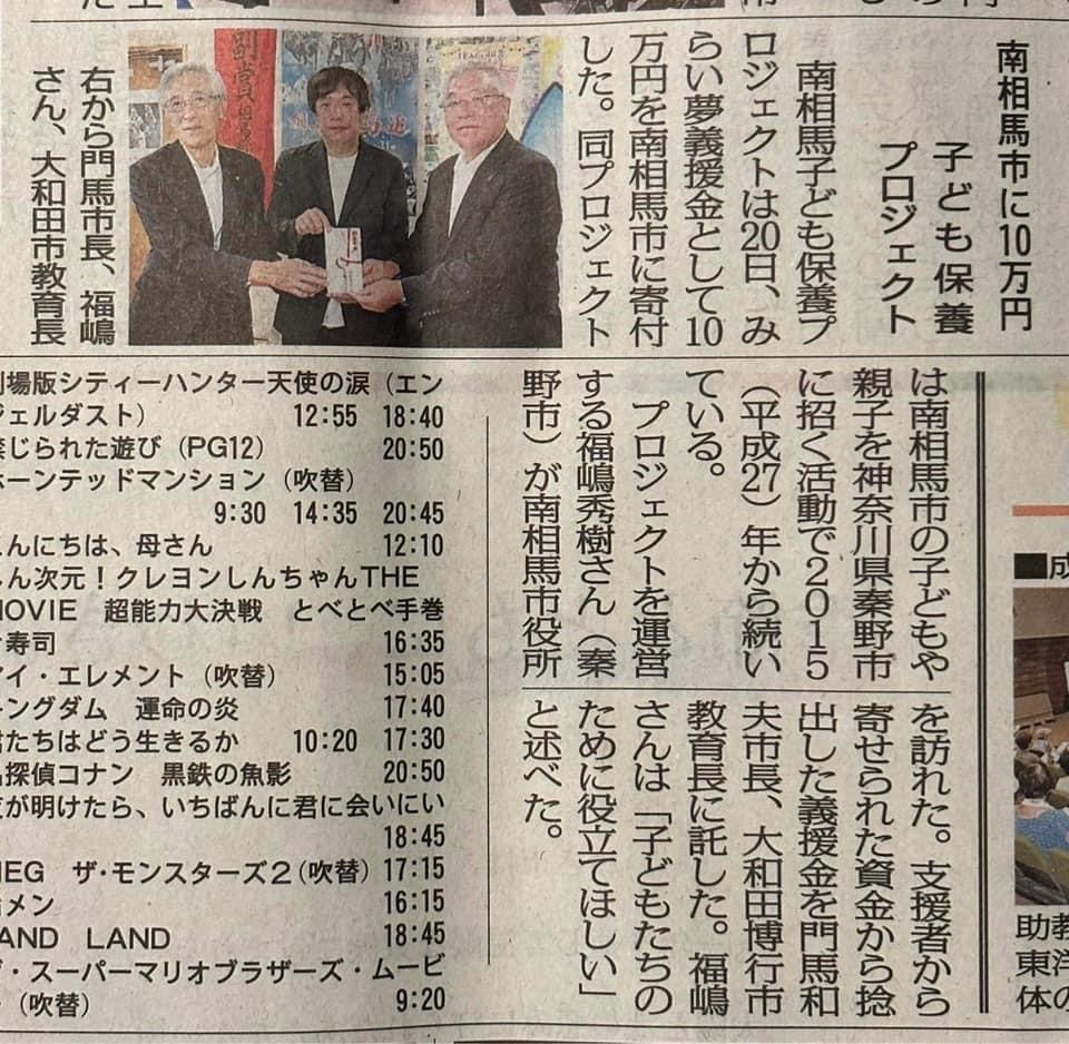 8月初旬に福島県南相馬市の子どもたちを神奈川県秦野市へご招待。無事終了したので南相馬市へ行き寄付金10万円を門馬市長へお渡ししに。南相馬市への寄付も2015年から始めたので早いもので8回目となります。
